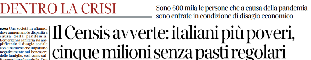 Corriere della Sera: “Il Censis avverte. Italiani più poveri, cinque milioni senza pasti regolari”