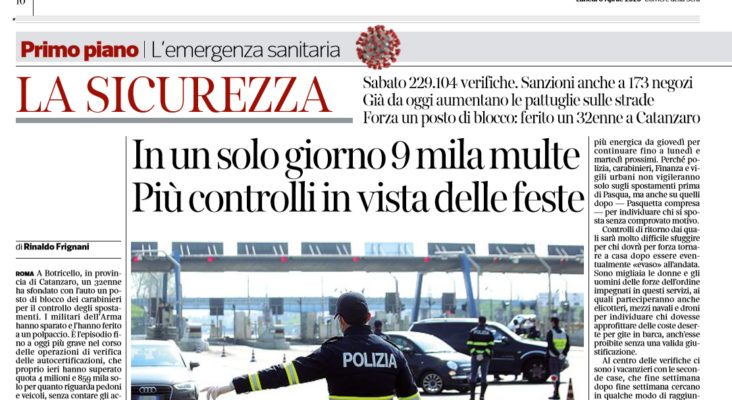 L’edizione odierna del “Corriere della Sera” si sofferma sulle denunce per inosservanza dei provvedimenti delle autorità. Solo sabato, secondo i dati del Viminale, ci sono stati 229.104 controlli a persone e 87.364 ad attività commerciali, con 9.284 multe. In vista di Pasqua, i posti di blocco saranno dislocati un po’ ovunque. Parteciperanno anche elicotteri e droni per individuare chi dovesse approfittare delle coste deserte per gite in barca. Gli accertamenti sulle autocertificazioni di chi proverà a giustificare l’uscita con falsi motivi di lavoro o di urgenze familiari, saranno svolti effettuando riscontri anche nei giorni successivi al controllo.