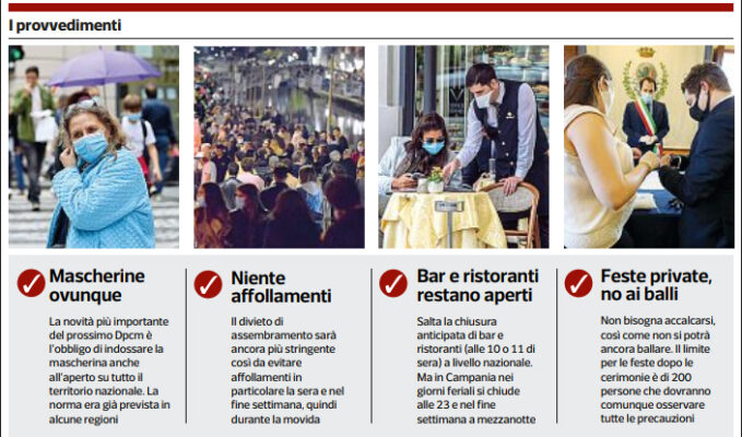 L’edizione odierna del “Corriere della Sera” si sofferma sulla nuova stretta del governo. Ad eccezione di viaggi in macchina da soli, spostamenti in moto o in bici, passeggiate in luoghi isolati, la mascherina andrà sempre indossata. Rimane il divieto di assembramento. Per ottenere il rispetto delle regole sono previste sanzioni pesanti: da 550 a 3.000 euro per chi non indossa la mascherina o la porta sotto il mento, multe e possibilità di chiusura per i locali che non faranno rispettare i divieti.