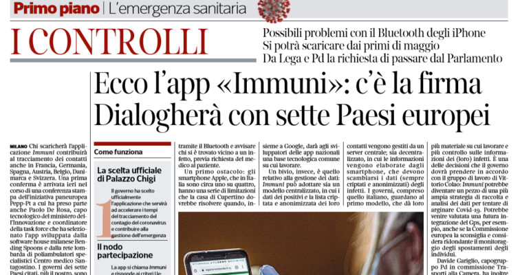 Corriere della Sera: “Italia. Ecco l’app «Immuni»: c’è la firma. Dialogherà con sette Paesi europei”