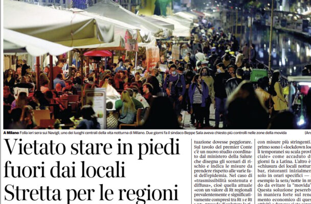 Corriere della Sera: “La lotta del virus in Italia. Il nuovo Dpcm «Vietato stare in piedi fuori dai locali. Stretta per le regioni»”