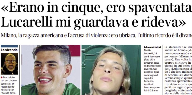 Corriere della Sera: “La ragazza americana che accusa Lucarelli junior e Federico Apolloni di stupro: «Erano in cinque. Ero ubriaca, Mattia rideva»”