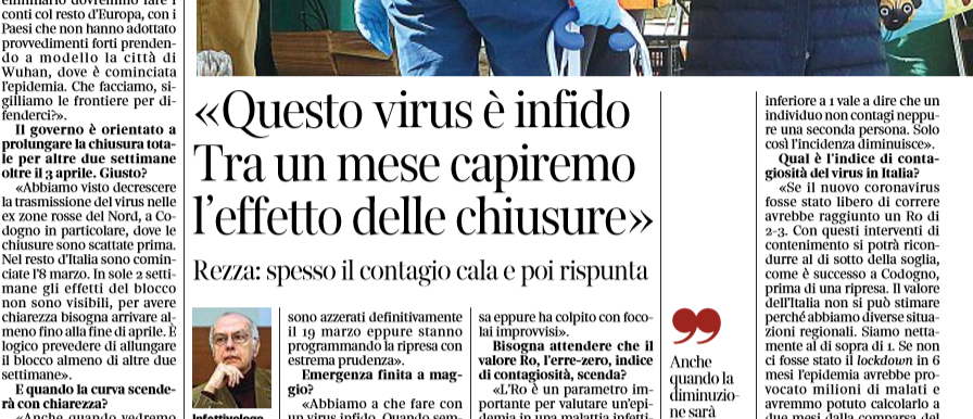 L’edizione odierna del “Corriere della Sera” riporta le dichiarazioni di Giovanni Rezza, direttore del dipartimento malattie infettive Istituto Superiore di Sanità: «Ancora dobbiamo vedere gli effetti chiari delle misure di contenimento e già pensiamo alla vita normale? Non esiste. Il virus non scompare per incanto e se anche avessimo la bacchetta magica per eliminarlo dovremmo fare i conti col resto d’Europa, con i Paesi che non hanno adottato provvedimenti forti prendendo a modello la città di Wuhan, dove è cominciata l’epidemia. Abbiamo visto decrescere la trasmissione del virus nelle ex zone rosse del Nord, dove le chiusure sono scattate prima. Nel resto d’Italia sono cominciate l’8 marzo. In sole 2 settimane gli effetti del blocco non sono visibili, per avere chiarezza bisogna arrivare almeno fino alla fine di aprile. Emergenza finita a maggio? Abbiamo a che fare con un virus infido. Quando sembra aver mollato ecco che rispunta fuori, pronto a ripartire rapidamente. In Italia, le chiusure sono state progressive e quindi non è possibile prevedere la data del picco».