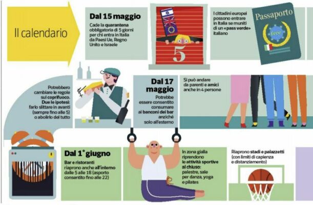Sul fronte delle consumazioni al bar, dal 1° giugno si potrà stare nei locali anche al chiuso, ma sempre seduti al tavolo. Il 15 maggio riaprono le piscine all’aperto e il 1° giugno si potrà tornare in palestra. Ma nessuna data è stata fissata per le piscine al chiuso, con perdite pesanti per circoli sportivi e strutture che non hanno possibilità alternative.