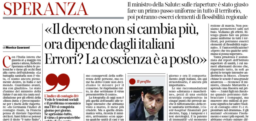 Corriere della Sera: “Speranza “Il decreto non si cambia più, ora dipende dagli italiani. Rischio nuova ondata…”
