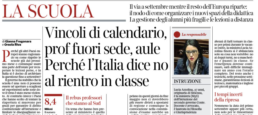 Corriere della Sera: “Vincoli di calendario, prof fuori sede, aule. Perché l’Italia dice no al rientro in classe”