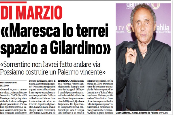 “«Senza di lui, non ci saremmo salvati …», firmato Roberto Sorrentino. “Lui” è Gianni Di Marzio, per tutti protagonista della rivoluzione nello spogliatoio palermitano. E’ stato lui a riportare il sorriso, a sanare i contrasti, a integrare italiani e stranieri, a distruggere gruppi e gruppetti, a determinare chiarimenti decisivi tra personaggi che come Sorrentino e Ballardini si guardavano in cagnesco, perfino a fare parlare El Mudo («Per prova mi tengo le registrazioni!»). E a ipotizzare il programma per la prossima stagione, con riconferma della vecchia guardia e centralità di Gilardino, che Zamparini ha inaugurato salutando Sorrentino“.