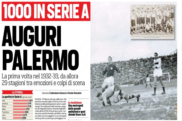 Corriere dello Sport: “1000 in serie A. Auguri Palermo. La prima volta nel 1932, da allora 29 stagioni tra emozioni e colpi di scena” (FOTO)