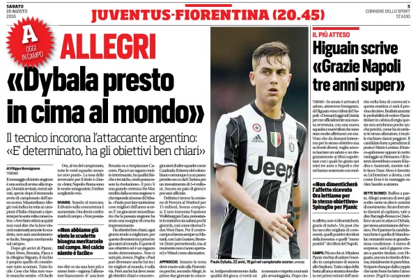 “Il messaggio di inizio stagione è una sorta di avviso alla truppa. Uomini avvisati, mezzi salvati, specie dopo il tremendo avvio di campionato dell’anno scorso. Massimiliano Allegri così indica la rotta ai campioni d’Italia chiamati a ripetersi per la sesta volta consecutiva: «Aver fatto ottimi acquisti non vuol dire che la Juve vincerà matematicamente lo scudetto, non sarà assolutamente facile, bisogna meritarselo sul campo». Dopo gli arrivi di Pjanic, Dani Alves, Benatia, Pjaca e la ciliegina Higuain, il rischio è proprio quello di considerare tutto scontato. Tutto facile. Cose che Max non vuole neanche sentire. «Di facile non c’è niente, soprattutto nel calcio – riflette – Facciamo un passo alla volta, come è giusto che sia: l’obiettivo è arrivare a marzo in lotta per tutte e tre le competizioni. E da lì ci giocheremo la stagione. Ora, al via del campionato, tutte le venti squadre avranno zero punti». La rosa delle avversarie per il titolo è chiara: «Inter, Napoli e Roma sono le nostre antagoniste, l’ordine sceglietelo voi». DIVARIO. Stando al mercato, il divario sulla concorrenza è aumentato. Ora dovrà confermarlo il campo. «Non possiamo dire se sia una Juve più o meno forte – ragiona l’allenatore bianconero -E’ una Juve diversa, sono arrivati giocatori con caratteristiche diverse. Non avevamo Pjanic, ma Pogba che è più fisico. Higuain è un giocatore straordinario, Dani Alves è differente da Lichtsteiner e Cuadrado. Benatia va a rimpiazzare Caceres. Pjaca è un ragazzo molto interessante, ha qualità fisiche e tecniche, credo possa essere la rivelazione». E poi c’è una grande certezza che Max eredita dalla scorsa stagione e che risponde al nome di Dybala. «Paulo può fare tantissime cose migliori dell’anno scorso. E’ un giocatore straordinario che la passata stagione ha avuto una margine di crescita impressionante. Ha obiettivi ben chiari, ogni giorno tende a migliorare, per questo diventerà tra i primi tre giocatori al mondo. È questo il suo obiettivo ed è un ragazzo molto determinato». Non ci sarà più, invece, Pogba: «Paul può diventare anche lui tra i tre migliori al mondo, è sulla via. Però anche lui deve avere gli obiettivi chiari e crescere». MERCATO. In ogni caso, la Juve non è ancora completa. Manca ancora un centrocampista, se non due, ma questo dipenderà dalle cessioni. Allegri non vuole parlare di mercato, né di giocatori di altre squadre come Cuadrado. Il ritorno del colombiano comunque è a un passo: prestito secco dal Chelsea per un investimento di 3-4 milioni. Ancora un paio di giorni e poi sarà ufficiale. Definita è invece la cessione di Pereyra al Watford per 15 milioni, bonus compresi. E non tramonta l’opzione Wolfsburg per Zaza, nonostante la trattativa sia saltata pochi giorni fa, così come ritorna l’idea West Ham. Per il centrocampo si lavora sempre su Matuidi, con Luiz Gustavo, Brozovic (Inter permettendo, ma al momento non ci sono aperture) e Witsel come alternative. APPROCCIO. Intanto la testa deve essere solo alla Fiorentina perché, secondo Allegri, le prime due giornate in concomitanza con il mercato «sono micidiali». «Anche quest’anno – aggiunge – ci sono cinque giocatori nuovi, sono solo 17 giorni che lavoriamo insieme e sicuramente ci vorrà un po’ di tempo. Nelle prime partite, indipendentemente dalla qualità del gioco, ci vorrà un approccio caratteriale importante. Sarà una partita molto difficile, perchè statisticamente nella prima parte della stagione fa sempre ottimi risultati. È una squadra brillante, con buona tecnica, non ha cambiato nessuno e rispetto a noi sarà più avvantaggiata. Dopo cinque anni di vittorie del campionato l’asticella delle difficoltà si alza sempre di più. Dobbiamo far tesoro di quello che è stato l’anno scorso»”. Questo quanto si legge sull’edizione odierna de “Il Corriere dello Sport”.
