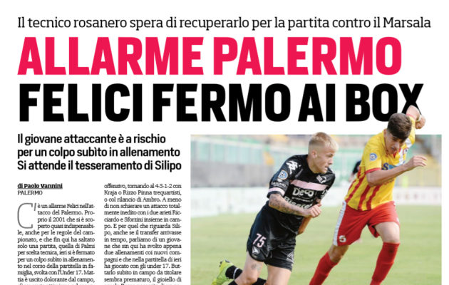 L’edizione odierna del “Corriere dello Sport” si sofferma sull’allarme Felici in casa Palermo. Ieri si è fermato per un colpo subito in allenamento nel corso della partitella in famiglia, svolta con l’Under 17. Mattia è uscito dolorante dal campo, c’è un cauto ottimismo sul suo recupero ma oggi, a poco più di 48 ore dalla gara col Marsala, le sue condizioni verranno rivalutate. Un suo forfait spingerebbe Pergolizzi a stravolgere l’assetto della formazione, impiegando Fallani fra i pali. Il tesseramento di Silipo non è stato ancora perfezionato.