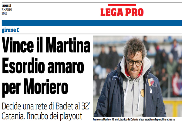 Da dimenticare la prima di Moriero, subentrato all’esonerato Pancaro sulla panchina del Catania. Gli etnei hanno perso di misura contro il Martina Franca e per loro c’è adesso l’incubo play out. Di seguito quanto si legge sul quotidiano “Il Corriere dello Sport”: “Il Martina vince ancora, raccoglie sei punti in due gare interne di fila e si avvicina al gruppo di formazioni che si giocheranno la permanenza in Lega Pro, spingendo all’inferno un Catania che solo nella ripresa ha dato l’impressione di poter recuperare il minimo passivo creato dalla rete di Baclet poco dopo la mezz’ora, nata da un bel cross di Berardino ma anche da una difesa blanda da parte di Bergamelli. Franceschini sceglie di confermare l’undici che ben aveva figurato contro il Catanzano ad eccezione di Diakite, infortunatosi in settimana, sostituito da Berardino a far coppia in attacco con il capocannoniere biancazzurro. Per la sua prima sulla panchina etnea Moriero conferma il 4-2-3-1 inserendo Pelagatti sull’esterno destro della linea difensiva e Bombagi nel trio composto da Calderini e Russotto alle spalle di Calil. Ritmo lento e protagonisti in campo impegnati a studiarsi nei primi trenta minuti. LA SVOLTA. Il Catania imposta partendo dalle retrovie, ricorrendo a lanci lunghi per la fase avanzata ben tamponata dai difensori pugliesi. Il Martina è più manovriero e propositivo ma senza creare pericoli alla porta di Liverani che, però, dovrà subire la rete che poi risulterà decisiva da parte di Baclet che all’interno dell’area di rigore è bravo a stoppare un pallone proveniente dalla sinistra e sul quale non fa buona guardia Bergamelli. Preciso il fendente di Berardino stoppato dall’attaccante francese che con un rasoterra batte in modo imparabile l’estremo difensore etneo. Un minuto dopo ancora Baclet di testa sugli sviluppi di un angolo prova a centrare i pali ma Liverani d’istinto evita la capitolazione. La reazione del Catania è tutta nella ciabattata di sinistro di Calderini dal limite dell’area terminata di poco out e sulla rete annullata a Russotto al 43′ per una carica subita da D’Orsi. La ripresa inizia con gli etnei diversi nell’atteggiamento e un Martina che abbassa il suo baricentro subendo di più rispetto alla prima frazione. Bombagi prova i riflessi di Viotti al sesto così come Calil con il destro al 27′. L’estremo martinese appare attento nelle occasioni pericolose create dagli ospiti e in tuffo riesce a deviare il preciso colpo di testa di Falcone in area al 31′. La superiorità territoriale degli ospiti è palpabile e si tramuta in un’azione convulsa a tre minuti dal termine: su un cross in area dalla sinistra Lupoli prova il tap-in (forse toccando con una mano), Viotti interviene a deviare in tuffo, la palla resta sulla linea. Marchetti s’immola di testa per spazzare in angolo il pallone, permettendo anche le cure a Viotti che nell’occasione rimane a terra dopo essere ricaduto colpendo il palo. Di qui in poi la pressione del Catania viene alleggerita da un Martina che con punizioni e precisi rinvii dalla linea difensiva. Il triplice fischio dell’arbitro coincide con la festa del Martina e con il confronto serrato tra gli etnei e i circa ottanta generosissimi tifosi ospiti”.