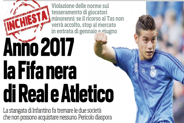 Corriere dello Sport: “Anno 2017, la Fifa nera di Real e Atletico. La stangata di Infantino fa tremare le due società”