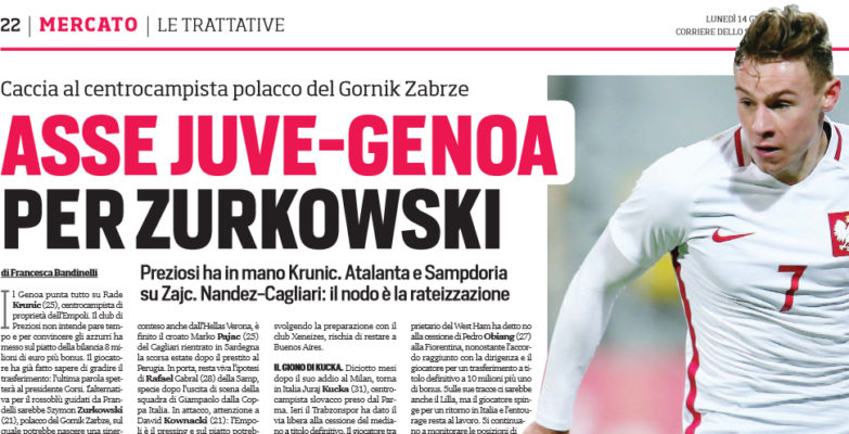 Corriere dello Sport: “Asse Juve-Genoa per Zurkowski. Tutte le trattative del giorno in serie A”
