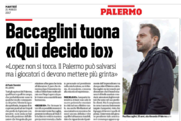 “DECIDO IO”. Per fermare le voci di un possibile esonero è dovuto intervenire Baccaglini, presente in tribuna al Friuli. E lo ha fatto in verità in maniera precisa intervenendo a “Radio 24”: «Il presidente del Palermo sono io e nessun altro. Ho un dialogo aperto con Zamparini, lui ha le sue opinioni ma decido io. E Diego Lopez, come ho detto qualche giorno fa, rimane fino a fine stagione». E’ abbastanza singolare anche che l’ex presidente abbia dovuto far pubblicare sul sito ufficiale un comunicato di precisazione. […]. Zamparini intendeva evitare non solo le nuove polemiche montate in città sul suo effettivo ruolo, ma anche fibrillazioni ad una trattati9va economica che non è ancora definita e vive equilibri abbastanza instabili dato che riguarda tutto il patrimonio dell’imprenditore e va dunque oltre il Palermo calcio. […]”. Questo quanto riportato da “Il Corriere dello Sport”.