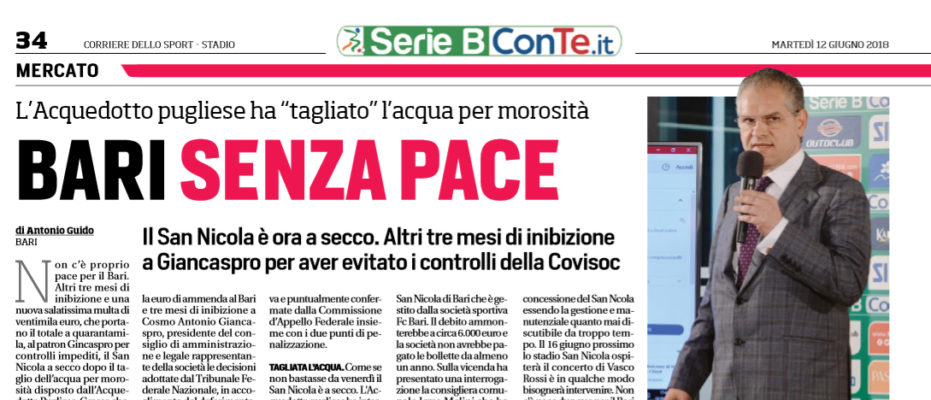 Corriere dello Sport: “Bari senza pace. L’Acquedotto pugliese ha “tagliato” l’acqua per morosità”