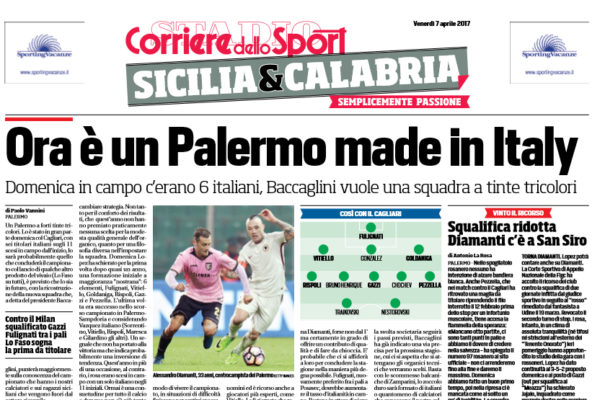 “Un Palermo a forti tinte tricolori. Lo è stato in gran parte domenica col Cagliari, con sei titolari italiani sugli 11 scesi in campo dall’inizio, lo sarà probabilmente quello che concluderà il campionato col lancio di qualche altro prodotto del vivaio (Lo Faso su tutti), è previsto che lo sia in futuro, con la ricostruzione della nuova squadra che, a detta del presidente Baccaglini, punterà maggiormente sulla conoscenza del campionato che hanno i nostri calciatori e sui ragazzi siciliani che vengono fuori dal settore giovanile. Dopo intere stagioni a rincorrere pretese stelle dell’Est, il Palermo del dopo Zamparini sembra intenzionato a cambiare strategia. Non tanto per il conforto dei risultati, che quest’anno non hanno premiato praticamente nessuna scelta per la modesta qualità generale dell’organico, quanto per una filosofia diversa nell’impostare la squadra. Domenica Lopez ha schierato per la prima volta dopo quasi un anno, una formazione iniziale a maggioranza “nostrana”: 6 elementi, Fulignati, Vitiello, Goldaniga, Rispoli, Gazzi e Pezzella. L’ultima volta era successo nello scorso campionato in Palermo-Sampdoria e considerando Vazquez italiano (Sorrentino, Vitiello, Rispoli, Maresca e Gilardino gli altri). Un segnale che non ha portato alla vittoria ma che indica probabilmente una inversione di tendenza. Quest’anno in più di una occasione, al contrario, i rosa erano scesi in campo con un solo italiano negli 11 iniziali. Ormai è una consuetudine per tutto il calcio e dunque non c’è più tanto da stupirsi ma il fatto è che il Palermo da questa multi etnicità non ha ricavato nulla. Anzi, molti dei giocatori provenienti da altre latitudini, non abituati al nostro modo di vivere il campionato, in situazioni di difficoltà finiscono per sentirsi spaesati e si perdono, sminuendo il loro valore e non riuscendo a rendersi utili per la squadra.