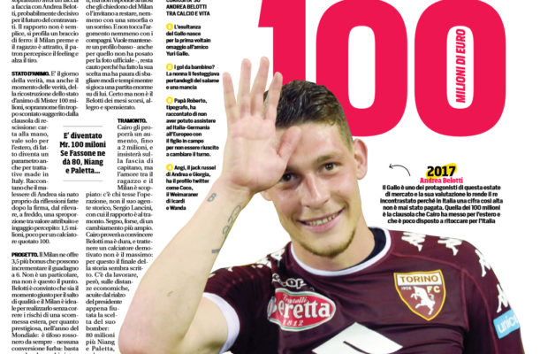 “Il giorno della verità. Oggi il presidente del Torino, Urbano Cairo, salirà a Bormio, dove la squadra granata è in ritiro: presenzierà a un evento legato agli sponsor e seguirà il test con l’Olginatese, ma soprattutto avrà un faccia a faccia con Andrea Belotti, probabilmente decisivo per il futuro del centravanti. Il rapporto non è semplice, si profi la un braccio di ferro: il Milan preme e il ragazzo è attratto, il patron percepisce il feeling e alza il tiro. STATO D’ANIMO. E’ il giorno della verità, ma anche il momento delle verità, della ricostruzione dello stato d’animo di Mister 100 milioni, soprannome fi n troppo scontato suggerito dalla clausola di rescissione: carta alla mano, vale solo per l’estero, di fatto diventa un parametro anche per trattative made in Italy. Raccontano che il malessere di Andrea sia nato proprio da rifl essioni fatte dopo la firma, dal rilevare, a freddo, una sproporzione tra valore attribuito e ingaggio percepito: 1,5 milioni, poco per un calciatore quotato 100. PROGETTO. Il Milan ne off re 3,5 più bonus che possono incrementare il guadagno a 6. Non è un particolare, ma non è questo il punto. Belotti è convinto che sia il momento giusto per il salto di qualità e il Milan è ideale per realizzarlo senza correre i rischi di una scommessa estera, per quanto prestigiosa, nell’anno del Mondiale: è tifoso rossonero da sempre – nessuna conversione furba: basta guardare le vecchie interviste – e cresciuto nel mito di Schevchenko, è sedotto dal progetto dell’ad Marco Fassone e del ds Massimiliano Mirabelli, sostenuto nella scelta dalla moglie Giorgia con cui si confronta moltissimo. SFINGE. A Bormio, non risparmia energie sul campo. Però diventa una sfi nge appena intuisce un accenno al futuro. Firma autografi , ma non risponde ai tifosi che gli chiedono del Milan o l’invitano a restare, nemmeno con una smorfia o un sorriso. E non tocca l’argomento nemmeno con i compagni. Vuole mantenere un profi lo basso – anche per quello non ha posato per la foto uffi ciale -, resta cauto perché ha fatto la sua scelta ma ha paura di sbagliare modi e tempi mentre si gioca una partita enorme su di lui. Certo ma non è il Belotti dei mesi scorsi, allegro e spensierato. TRAMONTO. Cairo gli proporrà un aumento, fino a 2 milioni, e insisterà sulla fascia di capitano, ma l’amore tra il ragazzo e il Milan è scoppiato: c’è chi tesse l’operazione, non il suo agente storico, Sergio Lancini, con cui il rapporto è al tramonto. Segno, forse, di un cambiamento più ampio. Cairo proverà a convincere Belotti ma è dura, e trattenere un calciatore demotivato non è il massimo: per questo il finale della storia sembra scritto.”. Questo quanto si legge sull’edizione odierna de “Il Corriere dello Sport”.