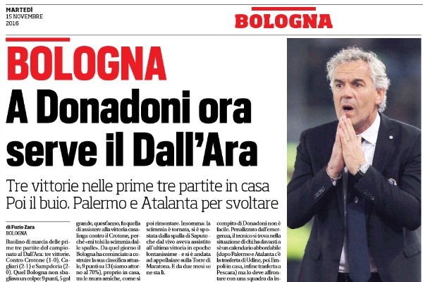 Corriere dello Sport: “Bologna, a Donadoni ora serve il Dall’Ara. Tre vittorie nelle prime tre partite in casa, poi il buio. Palermo e Atalanta per svoltare”