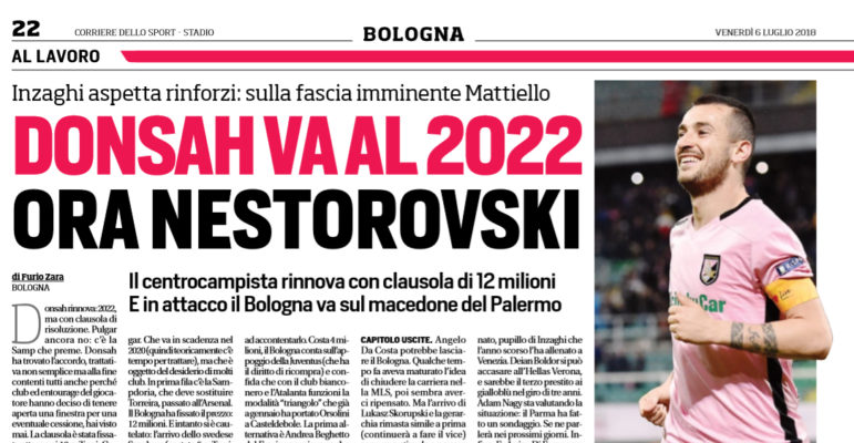 “Donsah rinnova: 2022, ma con clausola di risoluzione. Pulgar ancora no: c’è la Samp che preme. Donsah ha trovato l’accordo, trattativa non semplice ma alla fine contenti tutti anche perché club ed entourage del giocatore hanno deciso di tenere aperta una finestra per una eventuale cessione, hai visto mai. La clausola è stata fissata attorno ai 12 milioni. Godfred è pronto a mettersi in gioco, Inzaghi ha fatto sapere alla società che lo considera un elemento fondamentale. Il ghanese rimarrà (per ora) rossoblù. Nella sua testa il salto di qualità è tale solo se ne vale la pena, quindi se c’è l’occasione di salire di fascia. DUBBI PULGAR. Non vi sono certezze invece per Erick Pulgar. Che va in scadenza nel 2020 (quindi teoricamente c’è tempo per trattare), ma che è oggetto del desiderio di molti club. In prima fila c’è la Sampdoria, che deve sostituire Torreira, passato all’Arsenal. Il Bologna ha fissato il prezzo: 12 milioni. E intanto si è cautelato: l’arrivo dello svedese Svanberg (costato 5 milioni, ha firmato ieri il quinquennale) va in quella prospettiva. Così ieri l’ad Claudio Fenucci alla presentazione di Diego Falcinelli: «A Pulgar abbiamo confermato la nostra volontà di rinnovare. Lui sta bene qui e ci ha risposto di riparlarne a fine mercato». L’uomo per la fascia resta Federico Mattiello: Inzaghi lo vuole a tutti i costi e il Bologna proverà ad accontentarlo. Costa 4 milioni, il Bologna conta sull’appoggio della Juventus (che ha il diritto di ricompra) e confida che con il club bianconero e l’Atalanta funzioni la modalità “triangolo” che già a gennaio ha portato Orsolini a Casteldebole. La prima alternativa è Andrea Beghetto del Frosinone, piace anche Andrea Rispoli, a Palermo dal 2015. In attacco è stato fatto un sondaggio per Ilija Nestorovski, che Zamparini ha messo in vendita. L’attaccante macedone, che già in passato era entrato tra gli obiettivi del Bologna, è pronto al ritorno in serie A: due anni fa col Palermo chiuse segnando 11 gol, quest’anno ne ha realizzati 13 in B. CAPITOLO USCITE. Angelo Da Costa potrebbe lasciare il Bologna. Qualche tempo fa aveva maturato l’idea di chiudere la carriera nella MLS, poi sembra averci ripensato. Ma l’arrivo di Lukasz Skorupski e la gerarchia rimasta simile a prima (continuerà a fare il vice) sono uno stimolo a cercare altrove soddisfazioni. Lorenzo Crisetig sta continuando a trattare col Frosinone e non è partito per il ritiro: il Bologna punta alla cessione definitiva, i ciociari pensano ad un prestito con diritto di riscatto, oggi l’affare potrebbe chiudersi. Se Crisetig dovesse uscire, ecco che il Bologna farebbe un altro tentativo per prendere Marco Pinato, pupillo di Inzaghi che l’anno scorso l’ha allenato a Venezia. Deian Boldor si può accasare all’Hellas Verona, e sarebbe il terzo prestito ai gialloblù nel giro di tre anni. Adam Nagy sta valutando la situazione: il Parma ha fatto un sondaggio. Se ne parlerà nei prossimi giorni. Infine, Federico Di Francesco – che presto comincerà l’avventura col Sassuolo – ha salutato i colori rossoblù: «Bologna è stata un’esperienza fondamentale che mi ha fatto crescere sia dal punto di vista umano che professionale. Ringrazio i compagni, società e tifosi che mi hanno accompagnato dall’inizio in questo percorso»”. Questo quanto riportato dall’edizione odierna de “Il Corriere dello Sport”.