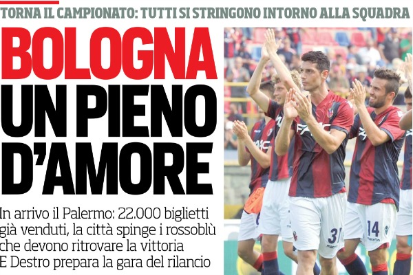 Corriere dello Sport: “Bologna, un pieno d’amore. In arrivo il Palermo: 22.000 biglietti già venduti, la città spinge i rossoblù”
