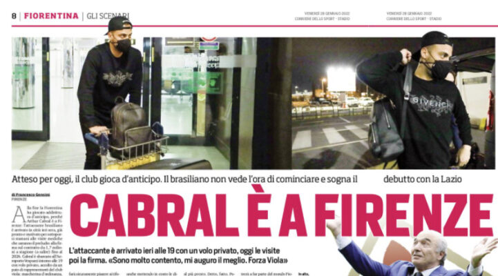 Alla fine la Fiorentina ha giocato addirittura d’anticipo, perché Arthur Cabral è a Firenze: l’attaccante brasiliano è arrivato in città ieri sera, già pronto e motivato per sottoporsi stamani alle visite mediche che saranno il preludio alla firma sul contratto da 1,7 milioni a stagione (a salire) fino al 2026. Cabral è sbarcato all’Aeroporto Vespucci intorno alle 19 con volo privato, accolto da un paio di rappresentanti del club viola: mascherina d’ordinanza, cappellino da baseball con visiera girata all’indietro, sguardo di uno che non vede l’ora, trolley e valigie sul carrello spinto a mano e via verso l’albergo per la sua prima notte fiorentina. Prima, però, cena in un ristorante a poche centinaia di metri dallo stadio Franchi e alcune parole intercettate da Sportitalia. «Sono molto contento di essere a Firenze. Mi auguro il meglio. Forza Viola».