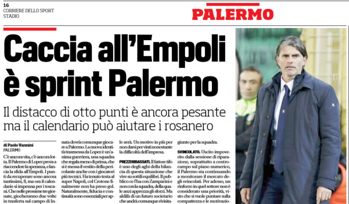 “C’è ancora vita, c’è ancora lotta. Il Palermo di Lopez prova a riaccendere la speranza, e lancia la sfida all’Empoli. I punti da recuperare sono ancora tantissimi, 8, ma ora il calendario si impenna per i toscani. Che nelle prossime tre giornate, giocheranno due volte in trasferta sul campo di Inter e Juventus e in casa riceveranno la Lazio. Anche il Palermo nello stesso periodo dovrà andare allo Juventus Stadium dove far punti appare un’utopia, ma avrà due match al Barbera, contro Atalanta e Sampdoria. E dopo essersi finalmente sbloccati con la prima vittoria interna dopo ben 8 mesi, i rosa sperano che lo stadio di casa torni ad essere un vantaggio di cui usufruire. PASSO DOPO PASSO. Non ci sono tabelle, ma c’è la ferma convinzione di potersela giocare. Passo dopo passo, giornata dopo giornata. Già da 11 i punti si sono ridotti a 8, e il cammino è ancora lungo. Nessuna intenzione di considerare la retrocessione un fatto acquisito. Stare là, attaccati, far sentire il fiato sul collo di un avversario che all’ultima giornata dovrà comunque giocare a Palermo. La nuova identità trasmessa da Lopez è un’anima guerriera, una squadra che regala meno di prima, che si è messa il vestito della pericolante anche con i giocatori più tecnici. Ha tenuto testa al super Napoli, col Crotone finalmente non ha preso gol. Naturalmente, fiducia e continuità sono essenziali per ap