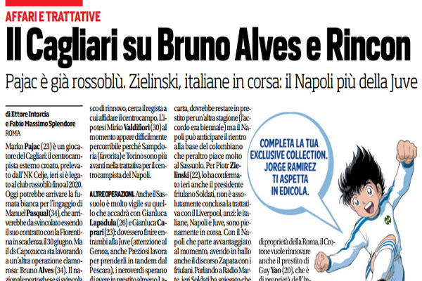 Corriere dello Sport: “Cagliari su Bruno Alves e Rincon, Pajac è già rossoblù. Zielinski, italiane in corsa: il Napoli più della Juve”