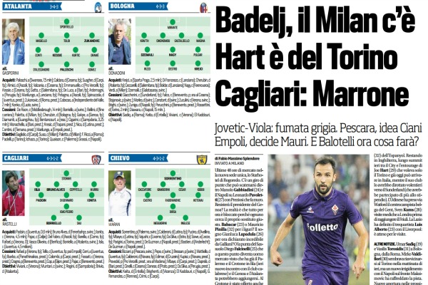 Corriere dello Sport, calciomercato serie A: “Badelj, il Milan c’è. Hart è del Torino. Cagliari: Marrone. Jovetic-Viola: fumata grigia. Pescara, idea Ciani. Empoli, decide Mauri. E Balotelli ora cosa farà?”