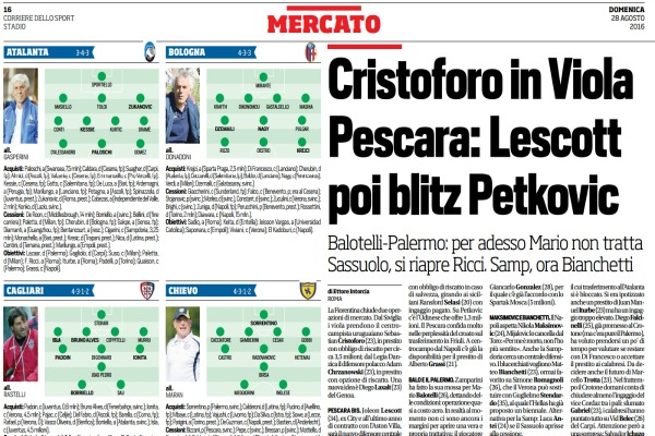 “La Fiorentina chiude due operazioni di mercato. Dal Siviglia i viola prendono il centrocampista uruguaiano Sebastian Cristoforo (23), in prestito con obbligo di riscatto per circa 3,5 milioni; dal Legia Danzica il difensore polacco Adam Chrzanowski (23), in prestito con opzione di riscatto. Una nuova idea è Diego Laxalt (23) del Genoa. PESCARA BIS. Joleon Lescott (34), ex City e all’ultimo anno di contratto con l’Aston Villa, sarà il nuovo difensore centrale del Pescara. Oggi incontro con l’agente, domani il trasferimento: Lescott risolverà il contratto con l’Aston Villa e firmerà un biennale. Il Pescara vuole fare anche un investimento in attacco: il nome è quello di Bruno Petkovic (21) del Trapani, da prendere in prestito con obbligo di riscatto in caso di salvezza, girando ai siciliani Ransford Selasi (20) con ingaggio pagato. Su Petkovic c’è l’Udinese che offre 1,3 milioni. Il Pescara confida molto nelle perplessità del croato sul trasferimento in Friuli. A centrocampo dal Napoli c’è già la disponibilità per il prestito di Alberto Grassi (21). BALO E IL PALERMO. Zamparini ha fatto la sua mossa per Mario Balotelli (26), dettando delle condizioni: operazione quasi a costo zero. In realtà al momento non ci sono ancora i margini per aprire una vera e propria trattativa: il giocatore dovrebbe praticamente azzerare il suo ingaggio e delle altre possibilità all’estero non mancano. Lui, SuperMario, non ha ancora preso una decisione sul futuro. Bruno Henrique (28), nuovo centrocampista del Palermo, è arrivato in Italia. Spinge per restare in rosanero anche Giancarlo Gonzalez (28), per il quale c’è già l’accordo con lo Spartak Mosca (5 milioni). MAKSIMOVIC E BIANCHETTI. Il Napoli aspetta Nikola Maksimovic (24), Mijalovic lo cancella dal Toro: «Per me è morto, non l’ho più sentito». Anche la Sampdoria cerca un centrale difensivo. I blucerchiati vogliono Matteo Bianchetti (23), ormai favorito su Simone Romagnoli (26), che il Verona può sostituire con Guglielmo Stendardo (35), al quale l’Hellas ha già proposto un biennale. Alternativa per la Samp: Luca Antei (24) se il Sassuolo aprisse alla cessione. SASSUOLO E CROTONE. Domani il Sassuolo formalizzerà l’accordo già trovato con lo Spezia per l’acquisto di Pietro Iemmello (24), che resterà ancora un anno in prestito in B. Intanto è tornato a lavorare forte su Federico Ricci (22) della Roma, il cui trasferimento all’Atalanta si è bloccato. Si era ipotizzato anche un prestito di Juan Manuel Iturbe (23) ma ha un ingaggio troppo elevato. Diego Falcinelli (25), già promesso al Crotone (ma c’era pure il Palermo), ha voluto prendersi un po’ di tempo per valutare se restare con Di Francesco o accettare il prestito ai calabresi. Da decidere anche il futuro di Marcello Trotta (23). Nel frattempo il Crotone domani conta di chiudere almeno l’ingaggio del vice Cordaz tra i pali: sfumato Gabriel (23), i calabresi hanno puntato tutto su Vid Belec (26) del Carpi. Attenzione però a una sorpresa: Salvador Ichazo (24). L’uruguaiano può muoversi in prestito (e il Crotone lo aveva già seguito) se il Toro farà chiarezza nella sua batteria dei portieri: alla finestra c’è anche l’Atalanta, in caso di partenza di Marco Sportiello (24). In B per Ichazo c’è il Bari”. Questo quanto si legge sull’edizione odierna de “Il Corriere dello Sport”.