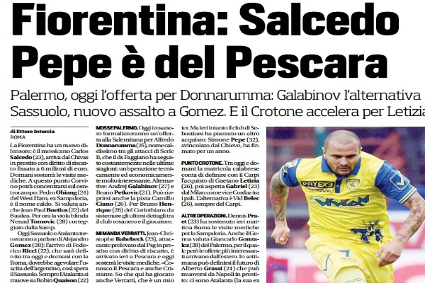 “La Fiorentina ha un nuovo difensore: è il messicano Carlos Salcedo (23), arriva dal Chivas in prestito con diritto di riscatto fissato a 6 milioni di euro. Domani sosterrà le visite mediche. A questo punto Corvino potrà concentrarsi sul centrocampo: Pedro Obiang (24) del West Ham, ex Sampdoria, è il nome caldo. Si valuta anche Jean Paul Boetius (22) del Basilea. Per ora la viola blinda Nenad Tomovic (28) corteggiato dalla Samp. Oggi Sassuolo e Atalanta torneranno a parlare di Alejandro Gomez (28): l’arrivo di Federico Ricci (22), che sarà definito tra oggi e domani con la Roma, dovrebbe agevolare l’uscita dell’argentino, così spera il Sassuolo. Sempre l’Atalanta si muove su Robin Quaison (22) del Palermo: ci sono concrete possibilità di poter chiudere l’affare in tempi stretti. Mosse Palermo. Oggi i rosanero formalizzeranno un’offerta alla Salernitana per Alfredo Donnarumma (25), nome caldissimo tra gli attacci di Serie B, che il ds Faggiano ha seguito costantemente nelle ultime stagioni: un’operazione tecnicamente ed economicamente molto interessante. Alternative: Andrej Galabinov (27) e Bruno Petkovic (21). Può riaprirsi anche la pista Camillo Ciano (26). Per Bruno Henrique (28) del Corinthians da sistemare gli ultimi dettagli tra il club rosanero e il giocatore. Mi manda Verratti. Jean-Christophe Bahebeck (23), attaccante prelevato dal Psg in prestito con diritto di riscatto, è arrivato ieri a Pescara e oggi sosterrà le visite mediche. «Conosco il Pescara e anche Cristante. So che qui ha giocato anche Verratti, che è un mio amico», ha detto ai microfoni di Sky Sport. Per la difesa si aspetta Eloge Yao (20) dall’Inter. Ma ieri intanto il club di Sebastiani ha piazzato un altro acquisto: Simone Pepe (32), svincolato dal Chievo, ha firmato per un anno. Punto Crotone. Tra oggi e domani la matricola calabrese conta di definire con il Carpi l’acquisto di Gaetano Letizia (26), poi aspetta Gabriel (23) dal Milan come vice Cordaz tra i pali. L’alternativa è Vid Belec (26), sempre del Carpi. Altre operazioni. Dennis Praet (23) ha sostenuto ieri mattina Roma le visite mediche per la Sampdoria. Anche il Genoa valuta Giancarlo Gonzalez (28) del Palermo, per il quale però le offerte più interessanti arrivano dall’estero. In settimana può definirsi il futuro di Alberto Grassi (21) che può muoversi da Napoli in prestito: ci sono Atalanta (la sua ex squadra), Sampdoria, Palermo e Pescara alla finestra”. Questo quanto si legge sull’edizione odierna de “Il Corriere dello Sport”.