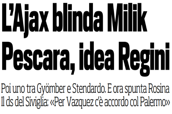 “Il Pescara ha sondato un nuovo obiettivo per la difesa: si tratta di Vasco Regini (25), centrale mancino rientrato alla Sampdoria dopo gli ultimi sei mesi trascorsi a Napoli senza che il club di De Laurentiis esercitasse l’opzione di riscatto, fissata a 2 milioni. La valutazione resta sostanzialmente quella ma Regini dovrebbe prima prolungare l’accordo con la Samp: l’operazione può includere il passaggio di Valerio Verre (22) in blucerchiato. Le altre piste per quel ruolo restano sostanzialmente due: un altro investimento su un giovane, Marko Leskovic (25) del Rijeka, o l’ingaggio di un leader d’esperienza, cioè Guglielmo Stendardo (35), che è all’ultimo anno di contratto con l’Atalanta. Oggi il giocatore incontrerà il club nerazzurro, che non vuole prolungargli il contratto: con una buona uscita dall’Atalanta potrebbe accettare il biennale su cui sta ragionando da tempo il Pescara. Che però aspetta anche Norbert Gyömber (24) dalla Roma: lui si muoverà appena entrerà anche il secondo centrale dopo Juan Jesus (). Nomi nuovi per la trequarti: Alessandro Rosina (32) e Mario Situm (24), quest’ultimo rientrato alla Dinamo Zagabria dopo il prestito allo Spezia. Crotone e Palermo. Gianmarco Ferrari (24) ha parlato a Sky Sport del suo futuro: «Il presidente ha detto che non sono sul mercato, ne stiamo parlando. Sono contento di essere qui, troveremo la soluzione migliore per entrambi». Il Crotone lo valuta 4 milioni di euro e la trattativa con la Fiorentina è in fase molto avanzata, al di là di schermaglie e smentite di circostanza. E dall’Argentina è atteso il via libera dell’Independiente per Gaston Del Castillo (19), il Kuncito, fratello minore di Sergio Aguero. Il padre del giocatore ha già detto sì. Due ingaggi baby: dal Reggio Calabria arrivano Michele Carrozza (17) e Francesco Villa (17). Franco Vazquez (27) al Siviglia è una pista ancora aperta, apertissima. Ieri il ds del club spagnolo, Monchi, ha fatto il punto sulla trattativa per l’italo-argentino e per il brasiliano Ganso (26): «Le trattative per Ganso e per Franco Vazquez sono sulla strada giusta ed entrambe sono in corso. Stiamo negoziando con San Paolo e Palermo e siamo relativamente ottimisti, ma c’è ancora molta strada da fare. Non ci sono problemi sulla parte economica ma sono altre circostanze che le stanno rallentando e non riguardano il Siviglia». Milik blindato. Nota ufficiale dell’Ajax che blinda Arkadiusz Milik (22): «L’Ajax e Milik hanno deciso di comune accordo che l’attaccante non si trasferirà in un’altra squadra in questa finestra di mercato. Qualora un club si facesse avanti con una proposta formale, non troverebbe la nostra collaborazione per concludere il trasferimento di Milik». Nei giorni scorsi Milik era stato in vacanza a Capri e aveva avuto contatti con il Napoli. Altre operazioni. Il Toro è ancora legato ai dubbi di Adem Ljajic (24), che per ora dice no al trasferimento in granata (occhio sempre alla Fiorentina…), e sonda il terreno con l’Empoli per Riccardo Saponara (24). L’Empoli nel fratemmpo continua a valutare l’opzione Lorenzo Crisetig (23). Fernando (24) allo Spartak Mosca, programmate le visite mediche: nelle casse della Sampdoria arrivano 12,5 milioni di euro. Il Genoa al centro della difesa stringe per Santiago Gentiletti (31) in uscita dalla Lazio. Per il Sassuolo la priorità è il nuovo laterale destro: in Italia piacciono Jacopo Sala (24) e Davide Zappacosta (24), all’estero il nome caldo è quello di Rich Karsdorp (21) del Feyenoord. Il Celta Vigo ha annunciato l’ingaggio di Facundo Roncaglia (29): svincolato dalla Fiorentina, ha firmato fino al 2020. Oggi il Bologna dovrebbe ufficializzare Adam Nagy (21), intanto Donadoni aspetta Umar Sadiq (19) dalla Roma. Il Cagliari pensa a Robert Gucher (25) del Frosinone per il centrocampo“. Questo quanto si legge nell’edizione odierna de “Il Corriere dello Sport”.