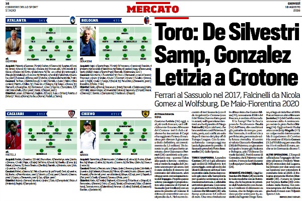 “Gaetano Letizia (26) oggi, o al più tardi domani, sarà ufficialmente il nuovo difensore del Crotone: ieri il club calabrese ha incontrato il Carpi e ha raggiunto l’intesa di massima per rilevare il giocatore a titolo definitivo, un investimento da 2,5 milioni. Un innesto in più nel pacchetto arretrato, dove Gianmarco Ferrari (24) cambierà solo proprietario ma – questa l’idea alla quale si lavora – continuerà a vestire la maglia del Crotone ancora per un anno. Ieri è stato definito il rinnovo del contratto del difensore, altri cinque anni con adeguamento dell’ingaggio. Proprio questo ultimo passaggio è propedeutico alla cessione di Ferrari al Sassuolo (per 4 milioni) con un anno in prestito al Crotone: il difensore resterebbe con uno stipendio da A. Nel nuovo incontro di ieri Sassuolo (con il ds Angelozzi) e Crotone (con il ds Ursino) hanno fatto passi in avanti, nell’operazione rientrerà anche il prestito di Diego Falcinelli (25) ai calabresi, che brucerebbero così il Palermo. Il tutto, però, sarà ratificato solo dopo il ritorno dei play off di Europa League. Con la stessa formula – compra oggi ma lascia il giocatore in prestito – il Sassuolo prenderà Pietro Iemmello (24) dallo Spezia. TORO E SAMPDORIA. Leandro Castan (29) si è già allenato agli ordini di Mihajlovic ieri pomeriggio, sotto gli occhi dei tifosi: il difensore arriva al Toro in prestito dalla Roma dopo essere già stato alla Sampdoria per qualche settimana con la medesima formula. L’ufficialità arriverà in giornata. Così come in giornata arriverà la firma di Lorenzo De Silvestri (28): alla Samp andranno 3,6 milioni di euro. Una vera rivoluzione in difesa visto che Gaston Silva (22), nonostante il blitz del Pescara, è andato al Granada. E la Samp? Per la fascia prende finalmente Dodò (24) dall’Inter, alle condizioni già pattutite da tempo: prestito biennale, 5 milioni circa per il riscatto, percentuale sulla futura rivendita. Al centro si valuta Giancarlo Gonzalez (28) del Palermo, un giocatore sul quale c’erano già Atalanta e Bologna, più l’Udinese (lo vuole Iachini). Però il nome di Gonzalez, che il Palermo vuole cedere, è venuto fuori durante i colloqui per Oscar Hiljekark (24). DE MAIO SÌ, VIA GOMEZ. Oggi Sebastian De Maio (28) sosterrà le visite mediche con la Fiorentina, che lo ha preso in prestito dall’Anderlecht con riscatto a 3 milioni: il difensore ex Genoa, che in Belgio era andato poche settimane fa, assistito dall’agente Diego Tavano, si lega ai viola fino al 2020. Può arrivare un altro difensore: Juninho (21) del Curitiba resta un nome caldo. A centrocampo resiste la pista Pedro Obiang (24). Oggi arriverà il baby attaccante Josip Magalic (17): un colpo molto interessante. Ma il capolavoro di Corvino è la cessione di Mario Gomez (31) al Wolfsburg per una cifra tra i 5 e 6 milioni di euro, anche se in Germania dicono 7. ALTRE OPERAZIONI. L’Empoli ufficializza l’ingaggio del terzino albanese Frederic Veseli (24): svincolato dal Lugano, ha firmato per due anni con un’opzione per estendere il contratto fino al 2020. Il Bologna annuncia Blerim Dzemaili (30). Futuro in Qatar per Seydou Keita (36): svincolato dalla Roma, l’ex centrocampista del Barcellona giocherà 6 mesi con l’Eljaish Sports Club”. Questo quanto si legge sull’edizione odierna de “Il Corriere dello Sport”.