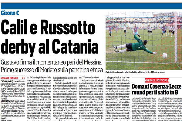“Un acuto e un sospiro di sollievo. Il Catania più brutto della nuova gestione Moriero si aggiudica il derby col Messina e fa un passo fondamentale nella corsa verso la salvezza. Si tratta di un primo passo, è chiaro, perché altri ne andranno fatti, ma se non si voleva restare vittime dei fantasmi, per dirla alla Moriero, e se si voleva continuare a coltivare il sogno permanenza in Lega Pro, beh, questo di riffa o di raffa era l’unico risultato utile per la formazione in maglia rossazzurra. Che di riffa o di raffa, in effetti, ha vinto. Moriero ha insistito sul 4-3-3. Calil è stato sistemato al centro dell’attacco, con Falcone e Russotto esterni che si sono scambiati di posizione; conferme in mezzo a centrocampo per Castiglia, mentre Agazzi è stato costretto all’ennesima staffetta con Musacci, di nuovo titolare con qualche piccolo merito. In difesa, dopo i disastri di Agrigento, Pelagatti è andato fuori e ha lasciato spazio a Bastrini. Sull’altra sponda, Di Napoli non ha cambiato granché. Barilaro è stato l’esterno basso di sinistra, mentre Scardina pare sia stato costretto ai box all’ultimo momento ed è stato avvicendato con un Biondo tutt’altro che esaltante. In panchina Padulano, che non ha ancora i 90′ nella gambe, ha solo dovuto attendere il proprio momento per gettarsi nella mischia in avvio di ripresa. Sciopero del tifo dei sostenitori delle due curve, a dispetto dei prezzi super popolari, come forma di protesta per i continui divieti imposti a questa tifoseria. Non ultimo quello per il fresco derby di Agrigento, che ha fatto il pari con quello – non gradito allo stesso modo – imposto per questa occasione alla gente di Messina: “Volete stadi come teatri, avrete stadi come questo”. Vuoto e silenzioso! Nel primo tempo il Messina ha dimostrato di avere più gamba. Al 15′ ha avuto una palla buona con Fornito, che da posizione appena decentrata ha spedito alle stelle. La risposta rossazzurra è stata affidata a un tiro di Musacci, finito d’un soffio a lato. Poi più nulla fino al calcio di rigore generosamente accordato per una caduta in area di Calil, finito in mezzo a De Vito e Martinelli. Lo stesso brasiliano trasforma in maniera impeccabile. La squadra ospite è colpita duro e sparisce dal campo, ma in avvio di ripresa si presenta per tre volte al tiro dalla distanza: la mira è spesso difettosa. Cosicché è il Catania ad avere la palla buona per chiudere la partita: Castiglia, con lo specchio della porta spalancato, manda fuori da posizione favorevolissima un invito di Falcone. Gol sbagliato, gol subìto. La legge del calcio non sbaglia mai. E infatti il Messina, nell’unica azione ragionata da cima a fondo va a cogliere un pareggio meritato: circolazione di palla per linee orizzontali, Giorgione sfonda dalla parte in cui avrebbero dovuto trovarsi uno fra Di Cecco e l’esterno alto e il cross per la testa di Gustavo è millimetrico. Il brasiliano giallorosso, non proprio un gigante, fa l’uno a uno. Stavolta è il Catania ad accusare il colpo, ma il Messina non ne approfitta. Moriero torna al 4-2- 3-1 che forse esprime meglio le qualità di questa squadra, mettendo un Calderini finalmente affamato. Il Catania trova lo spiraglio giusto con Russotto e lo fa, praticamente, in controfuga: Ionut e Martinelli non sono impeccabili, Berardi non può nulla sul diagonale preciso dell’attaccante. La gioia dei rossazzurri è travolgente”. Questo quanto si legge sull’edizione odierna de “Il Corriere dello Sport”.