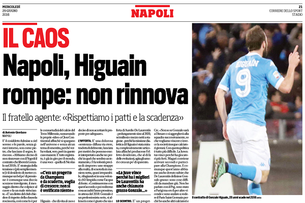 Corriere dello Sport: “Caos Napoli, Higuain rompe: non rinnova”