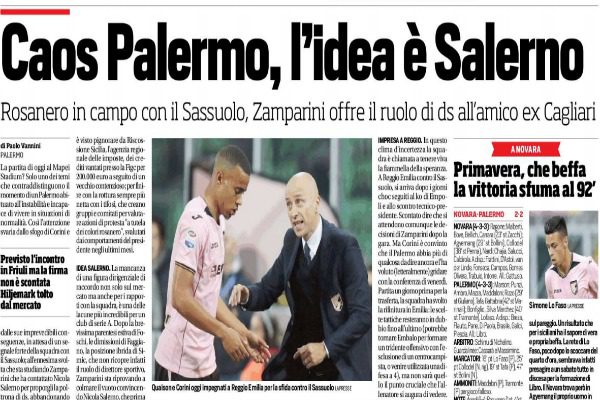 “La partita di oggi al Mapei? Solo uno dei temi che contraddistinguono un Palermo abituato all’instabilità e incapace di vivere situazioni di normalità. […] Zamparini ha contattato Salerno per proporgli la poltrona di ds, abbandonando dopo neppure 40 giorni l’idea Simic; alla mossa a sorpresa con cui a quanto pare il presidente ha tolto dal mercato Hiljemark; alle difficoltà economiche sempre più pesanti vissute dal club, si è visto pignorare da Riscossione Sicilia, l’agenzia regionale delle imposte, dei crediti vantati verso la Figc per 200 mila euro. Tornando a Salerno: “[…] che prima di essere un valente dirigente di calcio un amico personale di Zamparini. Dopo l’esperienza in Premier con Cellino, Salerno è libero: il contatto è ben avviato ma ancora non del tutto definito. […] nei primi giorni della settimana Zamparini e Salerno si incontreranno […] ma la firma non è scontata. L’impressione è che il dirigente materano chiederà mano libera per lavorare in una situazione tanto complicata. Dunque niente consiglieri intorno, quelli che da anni condizionano le scelte del patron. Zamparini accetterà?”. Questo ciò che si legge sull’edizione odierna de “Il Corriere dello Sport”.