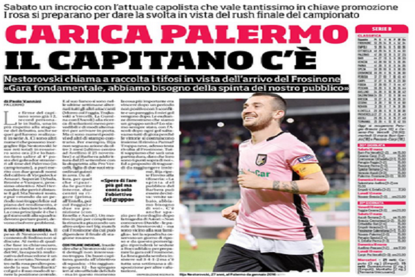 Corriere dello Sport: “Carica Palermo, il capitano c’è e chiama a raccolta i tifosi: «Serve la vostra spinta»”
