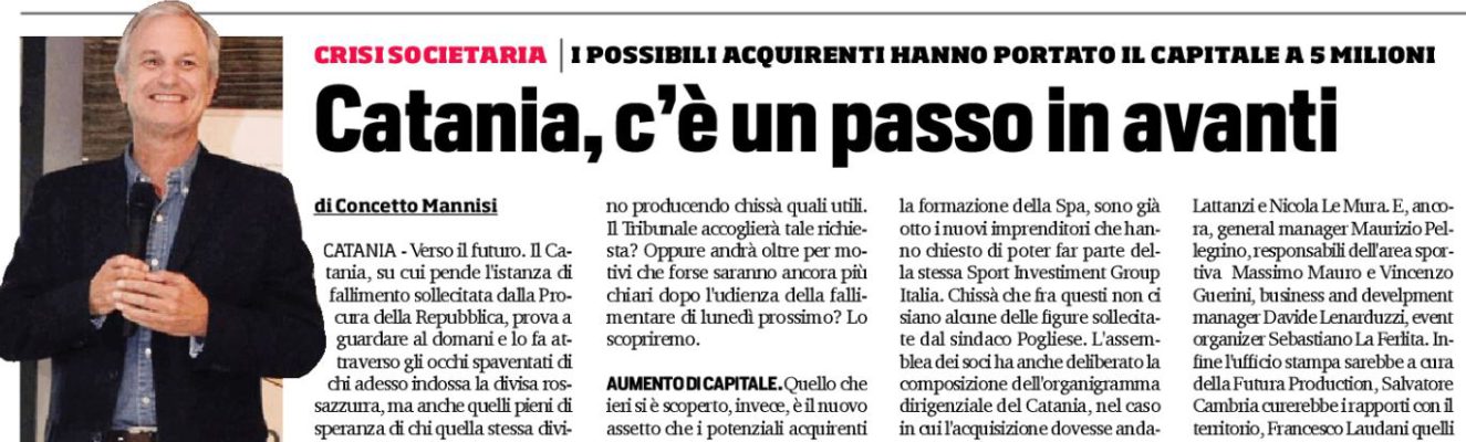 L’edizione odierna del “Corriere dello Sport” si sofferma sulla situazione del Catania. La Spa organizzata da Pagliara e Pellegrino ha deliberato l’aumento di capitale della società da 55 mila euro a 5 milioni di euro per l’acquisto del Catania. Comunicati i nomi dell’eventuale Cda nel caso in cui l’acquisizione andasse in porto. Il presidente sarebbe Fabio Pagliara, con l’ex prefetto Girolamo Fazio come vice. Pellegrino occuperebbe il ruolo di general manager.