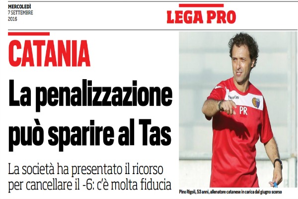 Corriere dello Sport: “Catania, la penalizzazione può sparire al Tas. La società ha presentato il ricorso per cancellare il -6: c’è molta fiducia”