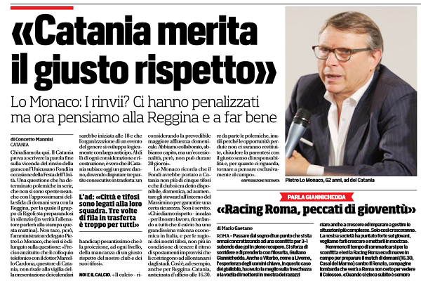 Corriere dello Sport: “«Catania merita il giusto rispetto». Lo Monaco: «I rinvii? Ci hanno penalizzati»”