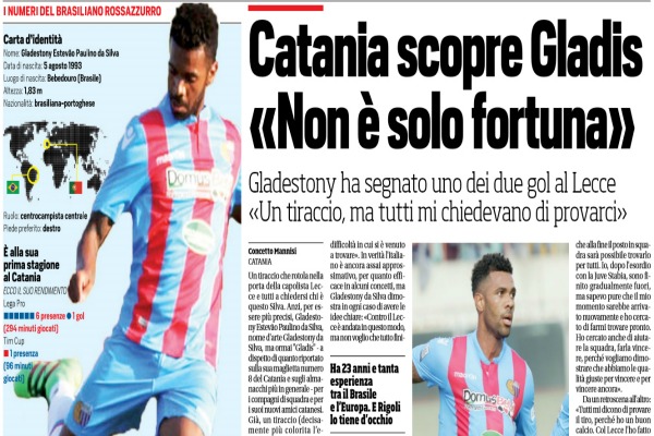 “Un tiraccio che rotola nella porta della capolista Lecce e tutti a chiedersi chi è questo Silva. Anzi, per essere più precisi, Gladestony Estevão Paulino da Silva, nome d’arte Gladestony da Silva, ma ormai “Gladis” – a dispetto di quanto riportato sulla sua maglietta numero 8 del Catania e sugli almanacchi più in generale – per i compagni di squadra e per i suoi nuovi amici catanesi. Già, un tiraccio (decisamente più colorita l’espressione usata dal giocatore a fine gara), perché non è che quella sua conclusione dai venti metri verso il portiere pugliese Bleve fosse irresistibile. Lo sa perfettamente anche “Gladis”, che con grande onestà lo ha ammesso: «Credo che se il mio tiro non fosse stato deviato dal difensore del Lecce il loro portiere lo avrebbe facilmente parato. Poco male, perché sono arrivati i tre punti che a noi servivano dopo il pareggio di Melfi e che dimostrano come questo Catania abbia tutti i mezzi per venire fuori dalla situazione di difficoltà in cui si è venuto a trovare». In verità l’italiano è ancora assai approssimativo, per quanto efficace in alcuni concetti, ma Gladestony da Silva dimostra in ogni caso di avere le idee chiare: «Contro il Lecce è andata in questo modo, ma non voglio che tutto finisca così. Alla prossima occasione voglio realizzare un gol buono, per una vittoria pesante e che alla base abbia la tecnica giusta». esperienza. Già, la tecnica. Quella che si chiede a un giocatore brasiliano. Ancora di più se lo stesso si disimpegna nel reparto centrale del campo. Ancora di più se si considera che “Gladis” non ha giocato soltanto in Brasile, ma anche in Olanda (al Twente), in Portogallo (all’Estoril) e pure in Spagna (al Cartagena). Non esattamente un globetrotter, è vero, ma un calciatore che a soli 23 anni di esperienza internazionale ne ha accumulata un bel po’ e che, in virtù di questa, ha pure acquisito quel passaporto portoghese che adesso gli ha permesso di trovare casa ai piedi dell’Etna. A lui e alla moglie Laura, che aspetta un figlio ed alla quale Gladestony da Silva ha subito dedicato la marcatura che ha contribuito a mandare al tappeto la capolista: «Lei sta sempre con me ed è stato giusto dedicarle questa rete». Si parlava di tiri e di tecnica. “Gladis” svela anche alcuni retroscena: «L’allenatore mi ha sempre detto che la stagione è lunga e che alla fine il posto in squadra sarà possibile trovarlo per tutti. Io, dopo l’esordio con la Juve Stabia, sono finito gradualmente fuori, ma sapevo pure che il mio momento sarebbe arrivato nuovamente e ho cercato di farmi trovare pronto. Ho cercato anche di aiutare la squadra, farla vincere, perché vogliamo dimostrare che abbiamo le qualità giuste per vincere e per vincere ancora». Da un retroscena all’altro: «Tutti mi dicono di provare il tiro, perché ho un buon calcio. Col Lecce l’ho fatto ed è andata bene: la fortuna viene se si vuole. Però so che non basterà questo per garantirmi una maglia da titolare. L’allenatore dice che ho una buona tecnica, ma che solo questa non basta. È vero, soltanto con la tecnica non si vince. Piuttosto bisogna coniugare tecnica e intensità se si vuole fare bene, ancora di più in un campionato come quello in cui stiamo giocando. Mi è stato che se riuscirò a coniugare tecnica e intensità diventerò un grande “futbolista”. Voglio provarci e il lavoro è la strada giusta».”. Questo quanto si legge sull’edizione odierna de “Il Corriere dello Sport” .