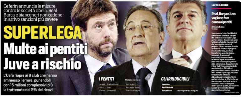 L’edizione odierna del “Corriere dello Sport” si sofferma sulle sanzioni comminerà la UEFA nei confronti delle società “ribelli”.