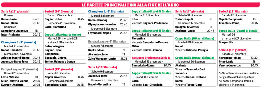“Fermate il Mondiale, voglio scendere. Mentre dobbiamo ancora decidere per chi tifare (l’Islanda e le sue tifose? Il solito Brasile? La Grande Madre Russia?) in quel terribile mese del 2018 che dovremo in qualche modo sorpassare, proviamo a distrarci con le nostre squadre di club. Visto il programma, la depressione post-Svezia dovrebbe passarci in fretta, dato che da qui alla fine di questo ahinoi indimenticabile 2017 ci aspettano cento partite (o 101, dipende dalla data definitiva del recupero tra Sampdoria e Roma) da vivere in appena 42 giorni. Dal derby romano fissato per le 18 di domani fino a Verona-Juventus, che si giocherà alle 20.45 del 30 dicembre, ci sarà da divertirsi: sette turni di campionato con stracittadine, sfide scudetto, partite di venerdì e di lunedì, più il tanto auspicato ritorno della serie A “natalizia”, grazie a due turni di campionato fissati per il 23 e il 30 dicembre. A fare da ricco contorno, gli impegni europei delle nostre sei rappresentanti, e la Coppa Italia. JUVE TRIS. Si riparte da una base solida, da una media spettatori (24.777) che non registravamo da qualche anno, sintomo di un campionato che piace per il nuovo entusiasmo che circonda le milanesi ma anche per la sua incertezza (le prime cinque della classifica sono racchiuse in 5 punti). Questi 42 giorni saranno determinanti in chiave scudetto, e considerando le “magnifiche 5” (Napoli, Juventus, Inter, Lazio e Roma) va ricordato che la Juventus è attesa da tre scontri diretti (contro Napoli, Inter e Roma), il Napoli solo dalla sfida con i Campioni. QUI STADIO OLIMPICO. Il ritorno alle gare è straordinario: si comincia appunto domani con il derby del Cupolone, il cui interesse, vista la classifica delle “cugine” (la Lazio è quarta e la Roma quinta, ma entrambe con una gara da recuperare) travalica finalmente i confini del Raccordo Anulare. In serata poi, spazio alla capolista, a quel Napoli del mai tanto evocato Insigne che aspetta al San Paolo un Milan a caccia di un grande scalpo. Pochi giorni – senza dimenticare un interessante Sampdoria-Juventus di domenica – e tornano le coppe con il programma dominato in Champions da una classica come Juventus-Barcellona (che solo due anni fa assegnò il trofeo). Decisive o quasi per l’approdo agli ottavi anche Napoli-Shakhtar e Atletico Madrid-Roma, mentre giovedì in Europa League Milan e Atalanta ptrebbero affiancarsi alla già qualificata Lazio. LE GRANDI SFIDE. Anche dicembre comincerà con il botto: venerdì 1, alle 20.45, si sfideranno al San Paolo il Napoli e la Juventus (alle 18 scenderà in campo la Roma, contro la Spal) che sono attese subito dopo dalle ultime sfide di Champions. Altri confronti da circoletto rosso sono Juventus-Inter del 9, Juventus-Roma del 23 e Inter-Lazio del 30. VIVA LE COPPE. Da seguire anche la Coppa Italia, che vedrà le prime otto teste di serie in campo a metà dicembre, pronte a sfidarsi nei quarti di fine anno e inizio gennaio: tra i possibili accoppiamenti anche Milan-Inter e Juventus-Roma. Intanto, l’11 dicembre si sarà svolto il sorteggio per Champions e Europa League. Non vinciamo la coppa più importante dall’Inter del 2010, mentre l’Europa League aspetta ancora il primo trionfo tricolore (nel 1999 l’ultima Coppa Uefa “italiana”, per merito del Parma). Chissà, vuoi vedere che la ripartenza del calcio italiano scatterà da Kiev o da Lione, sedi delle due finali?”. Questo quanto riportato da “Il Corriere dello Sport”.