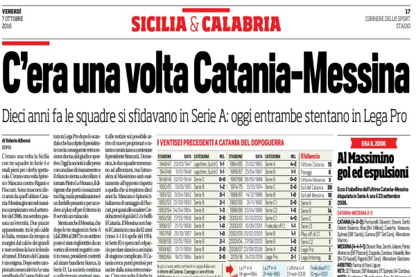 “C’erano una volta la Sicilia con tre squadre in Serie A e stadi pieni per i derby spettacolo. C’erano una volta Spinesi e Mascara contro Riganò e Floccari. Sono trascorsi dieci anni da quell’ultimo Catania-Messina giocato nel massimo campionato: era il settembre del 2006, ma sembra passata un’eternità. Due piazze appassionate, tra le più calde in Italia, restano da tempo ai margini dal calcio dei grandi e non vedono la luce in fondo al tunnel. Il futuro del Catania è un enigma. Dopo sette campionati consecutivi in A e una semifinale di Coppa Italia nel 2008 sotto la gestione di Antonino Pulvirenti, il club prima è scivolato in Serie B, poi addirittura in Lega Pro dopo lo scandalo che ha colpito il presidente con la conseguente retrocessione decisa dal giudice sportivo. Oggi la società è alle prese con una fase di risanamento e il rilancio stenta a decollare: è tornato Pietro Lo Monaco, il dirigente che portò i rossazzurri tra i big, ma la penalizzazione è un fardello pesante e per accedere ai play off per il ritorno in B servirà un miracolo. Stenta anche il Messina, che dopo le tre stagioni in Serie A (dal 2004 al 2007) e un settimo posto è stato inghiottito da un vortice di eventi negativi: conti in rosso, presidenti costretti ad alzare bandiera bianca, la Serie D. La società continua a collezionare stagioni anonime in Lega Pro, intanto i tifosi si allontanano dal Franco Scoglio, assistono spazientiti alle notizie sul possibile arrivo di nuovi proprietari e intanto cominciano a contestare il presidente Stracuzzi. Domenica, le due squadre torneranno ad affrontarsi, ma l’atmosfera al Massimino sarà esattamente all’opposto rispetto a quella che si respirava dieci anni fa: Mascara e Spinesi ribaltarono il vantaggio di Floccari, poi quasi allo scadere Cordoba trovò il gol del 2-2 e beffò il Catania. Il Messina non batte il Catania in casa da 62 anni (vinse 3-1 il 4 aprile del 1954, in Serie B) e spera nel colpaccio per dare slancio a un inizio di stagione complicato. Il Catania cerca punti preziosi per uscire dalla zona retrocessione. C’era una volta il derby in Serie A. Oggi restano solo i ricordi.”. Questo quanto si legge sull’edizione odierna de “Il Corriere dello Sport”.