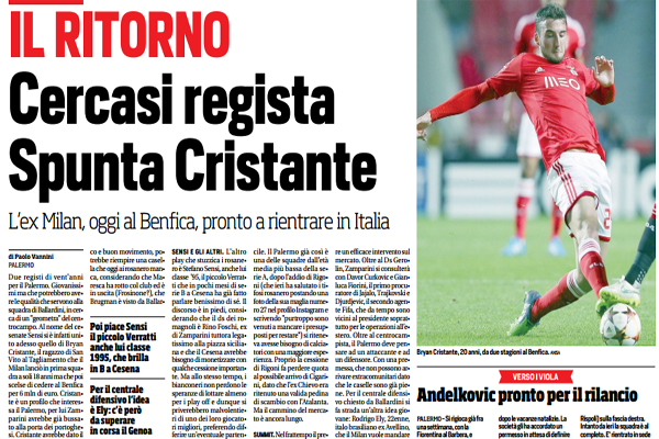 L’edizione odierna de “Il Corriere dello Sport” fa il punto sul mercato del Palermo: “Due registi di vent’anni per il Palermo. Giovanissimi ma che potrebbero avere le qualità che servono alla squadra di Ballardini, in cerca di un “geometra” del centrocampo. Al nome del cesenate Sensi si è infatti unito adesso quello di Bryan Cristante, il ragazzo di San Vito al Tagliamento che il Milan lanciò in prima squadra a soli 18 anni ma che poi scelse di cedere al Benfica per 6 mln di euro. Cristante è un profilo che interessa il Palermo, per lui Zamparini avrebbe già bussato alla porta dei portoghesi. Cristante avrebbe dato il suo assenso al ritorno in Italia anche perché al Benfica non ha avuto lo spazio che sperava. Una decina in tutto le sue presenze in una stagione e mezzo, pur in una grande del calcio europeo. Centrocampista centrale con ottima visione di gioco e buon movimento, potrebbe riempire una casella che oggi ai rosanero manca, considerando che Maresca ha rotto col club ed è in uscita (Frosinone?), che Brugman è visto da Ballardini più come trequartista e che Jajalo è adattato al ruolo. L’operazione non è semplice sul piano economico ma è un’opzione che il Palermo vaglierà con attenzione. Sensi e gli altri. L’altro play che stuzzica i rosanero è Stefano Sensi, anche lui classe ’95, il piccolo Verratti che in pochi mesi di serie B a Cesena ha già fatto parlare benissimo di sé. Il discorso è in piedi, considerando che il ds dei romagnoli è Rino Foschi, ex di Zamparini tuttora legatissimo alla piazza siciliana e che il Cesena avrebbe bisogno di monetizzare con qualche cessione importante. Ma allo stesso tempo, i bianconeri non perdono le speranze di lottare almeno per i play off e dunque si priverebbero malvolentieri di uno dei loro giocatori migliori, preferendo differire un’eventuale partenza a giugno. La trattativa va avanti e resta una di quelle con maggiore probabilità di conclusione favorevole. Il dubbio è relativo all’età dei due registi e conseguentemente alla loro capacità di reggere l’impatto con una situazione piuttosto difficile. Il Palermo già così è una delle squadre dall’età media più bassa della serie A, dopo l’addio di Rigoni (che ieri ha salutato i tifosi rosanero postando una foto della sua maglia numero 27 nel profilo Instagram e scrivendo “purtroppo sono venuti a mancare i presupposti per restare”) si riteneva avesse bisogno di calciatori con una maggiore esperienza. Proprio la cessione di Rigoni fa perdere quota al possibile arrivo di Cigarini, dato che l’ex Chievo era ritenuto una valida pedina di scambio con l’Atalanta. Ma il cammino del mercato è ancora lungo. Summit. Nel frattempo il presidente Zamparini trascorrerà i giorni di fine d’anno nella sua tenuta in Carinzia, a Bad Kleinkirchheim dove i rosanero effettuano la preparazione pre campionato. Là dovrebbe essere raggiunto dai suoi più stretti collaboratori per pianificare un efficace intervento sul mercato. Oltre al Ds Gerolin, Zamparini si consulterà con Davor Curkovic e Gianluca Fiorini, il primo procuratore di Jajalo, Trajkovski e Djurdjevic, il secondo agente Fifa, che da tempo sono vicini al presidente soprattutto per le operazioni all’estero. Oltre al centrocampista, il Palermo deve pensare ad un attaccante e ad un difensore. Con una premessa, che non possono arrivare extracomunitari dato che le caselle sono già piene. Per il centrale difensivo chiesto da Ballardini si fa strada un’altra idea giovane: Rodrigo Ely, 22enne, italo brasiliano ex Avellino, che il Milan vuole mandare a giocare altrove, dopo che il centrale ha perso il posto da titolare avuto a inizio stagione, e che piaceva al Genoa. Ma Zamparini potrebbe inserirsi magari proprio grazie al rapporto nato con la cessione di Rigoni ai liguri”.