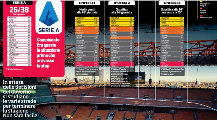 L’edizione odierna del “Corriere dello Sport” si sofferma sulle decisioni inerenti al campionato di Serie A. Un mese di tempo per stabilire le sorti del campionato. Entro il 25 maggio dovranno essere comunicate alla Uefa eventuali variazioni del format. Nel caso in cui non si dovesse riprendere più, l’Uefa vorrebbe conoscere le squadre partecipanti a Champions ed Europa League e i criteri di scelta relativi. La classifica di Serie A verrebbe cristallizzata alla 24a giornata e lo scudetto non verrebbe assegnato. Il Verona andrebbe in Europa League a discapito di Milan e Parma. Potrebbero essere retrocesse due squadre: Brescia e Spal. Ma quanto saranno d’accordo? Caos anche per le promozioni in Serie A. Il Crotone nutre un punto di vantaggio sul Frosinone, che non intende essere escluso dai giochi.