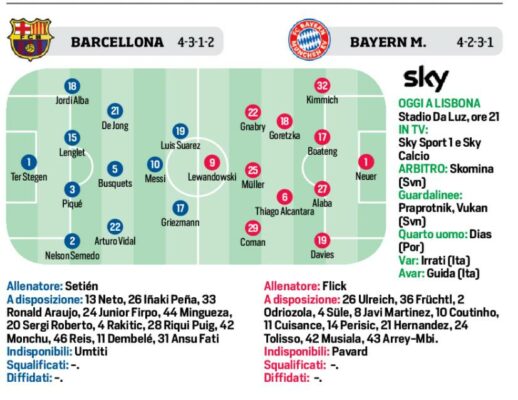 L’edizione odierna del “Corriere dello Sport” si sofferma sulla sfida di Champions League fra Barcellona e Bayern. In foto, le probabili formazioni secondo il quotidiano.