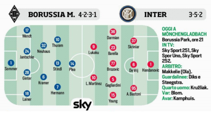 Corriere dello Sport: “Champions League. Stasera Borussia Monchengladbach-Inter. Le probabili formazioni”