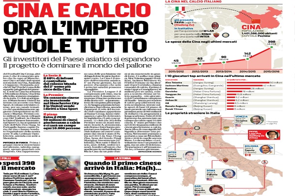 Corriere dello Sport: “Cina e calcio, ora l’impero vuole tutto. Gli investitori del paese asiatico si espandono, il progetto è dominare il mondo del pallone”