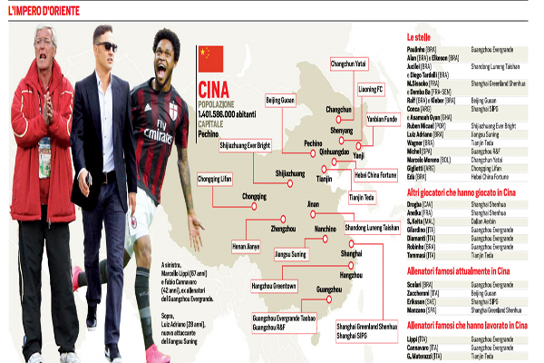 “La nuova frontiera del calcio mondiale è la Cina. Ormai da qualche stagione la nazione della Grande Muraglia ha iniziato a investire in maniera pesante nel pallone perché a quelle latitudini non si accontentano più di vedere i top club europei in tournée durante l’estate o di assistere in tv ai match della Premier League, il torneo europeo più seguito. Una fetta sempre più grande degli 1,4 miliardi di abitanti della Cina segue il calcio, ma per far aumentare il numero di appassionati servono i giocatori conosciuti e allora il terreno… di caccia sono i campionati europei. Il brasiliano Luiz Adriano è stato strappato al Milan grazie alla montagna di soldi messa sul tavolino dal Jiangsu Suning che adesso pensa a Fredy Guarin dell’Inter e addirittura a Yaya Touré del City, mentre Sven Goran Eriksson ha invitato Wayne Rooney a raggiungerlo allo Shangai SIPG. Almeno per il momento il bomber dello United ha rifiutato la proposta, ma in futuro non si sa mai. Perché in Cina, sapendo che non possono allettare i calciatori e i tecnici offrendo un campionato spettacolare e (in molti) casi neppure una vita in una città da sogno, propongono ingaggi da capogiro con un cospicuo anticipo al momento della firma. Difficile dire di no. Da Tommasi a Drogba. Vedendo le cifre che circolano adesso, Damiano Tommasi si starà mordendo le mani. Lui è stato il primo calciatore italiano a volare in Cina, nel febbraio 2009, per indossare la maglia del Tianjin Teda, ma 8 mesi più tardi è tornato in Italia. Guadagnava 40.000 dollari al mese, spiccioli in confronto ai 15 milioni l’anno che lo Shanghai Shenhua corrispondeva a un Drogba fresco di vittoria della Champions League con il Chelsea o ai 10 che versava ad Anelka. Drogba aveva firmato per 2 anni e mezzo, ma in Cina è resistito pochi mesi, complici anche i problemi con il versamento dello stipendio. Non è tutto oro quello che luccica o che… viene promesso. Tanti soldi li ha presi anche Gilardino: per lui contratto da 10 milioni per due anni e mezzo di contratto. L’ex campione del mondo però in Cina è rimasto solo 6 mesi nonostante come allenatore al Guangzhou Evergrande avesse un altro degli eroi di Berlino 2006, Marcello Lippi. L’ex ct nel 2012 fu spinto a dire di sì da un assegno annuo da 10 milioni che lo ha fatto diventare l’allenatore più pagato al mondo dopo Guardiola (Barcellona) e Mourinho (Real Madrid). In Cina ha stravolto le abitudini di far calcio, dall’alimentazione ai metodi di allenamento passando per i viaggi, e ha vinto 3 campionati, 1 Champions asiatica e una coppa di Cina. Fabio Cannavaro, suo successore, ha avuto meno fortuna perché, nonostante i buoni risultati, è stato esonerato per far posto a Felipe Scolari. Re Sven. A livello di tecnici, però, nessuno batte come ingaggio Eriksson che di milioni ne percepisce 19 ad annata dallo Shanghai SIPG. Non se la passa male neppure Alberto Zaccheroni che, con il suo biennale da 5 milioni a stagione firmato con il Beijing Guoan, vivrà a breve un’avventura ben remunerata. Con queste cifre in ballo ecco perché la Cina può sognare anche i campioni. Ha agganciato Luiz Adriano, sogna Touré e Rooney, magari avrà Doumbia, in estate seguito dallo Shanghai Shenhua prima che il club prendere l’ex Chelsea Demba Ba, uno dei due bomber arrivati nella Chinese Super League (l’altro è Alan, capocannoniere dell’Europa League 2014-15 con il Salisburgo)”. Questo quanto si legge sull’edizione odierna de “Il Corriere dello Sport”.
