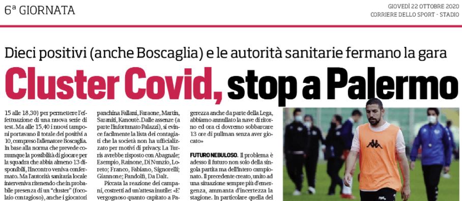L’edizione odierna del “Corriere dello Sport” si sofferma sul rinvio in extremis di Palermo-Turris a causa del cluster Covid esploso nella squadra rosanero.